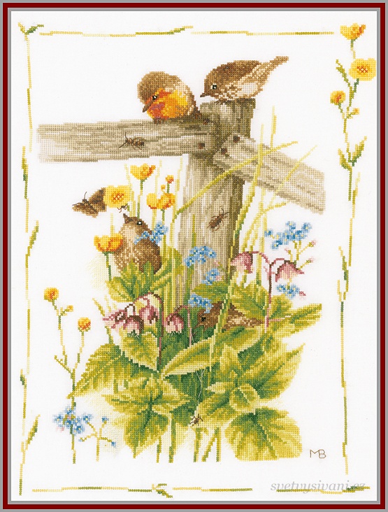Sada obsahuje : bavl.přízi DMC, 100% bavl.látku ecru (10,5 vláken/cm) s podbarveným pozadím,které se nevyšívá, papírovou předlohu,jehlu.